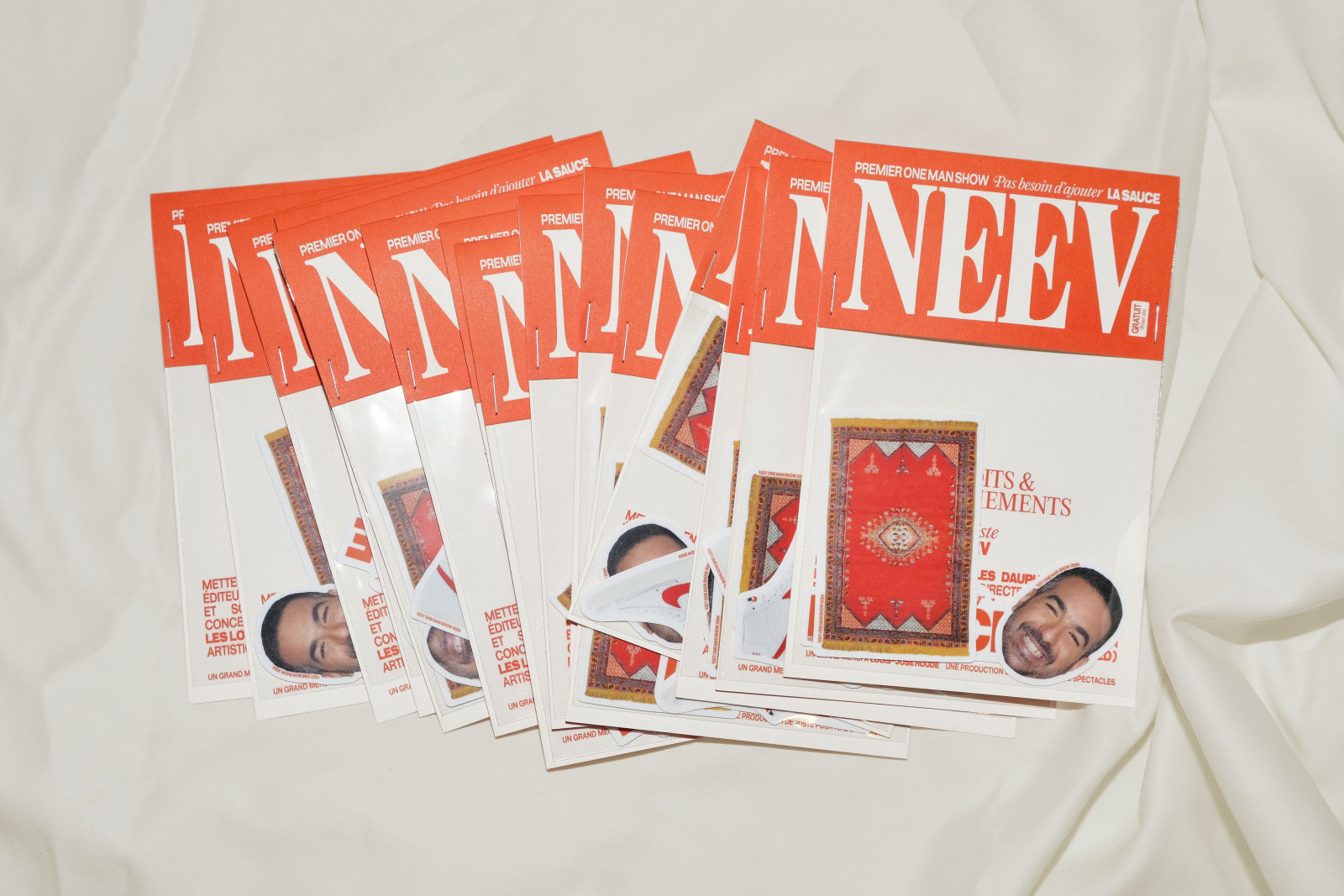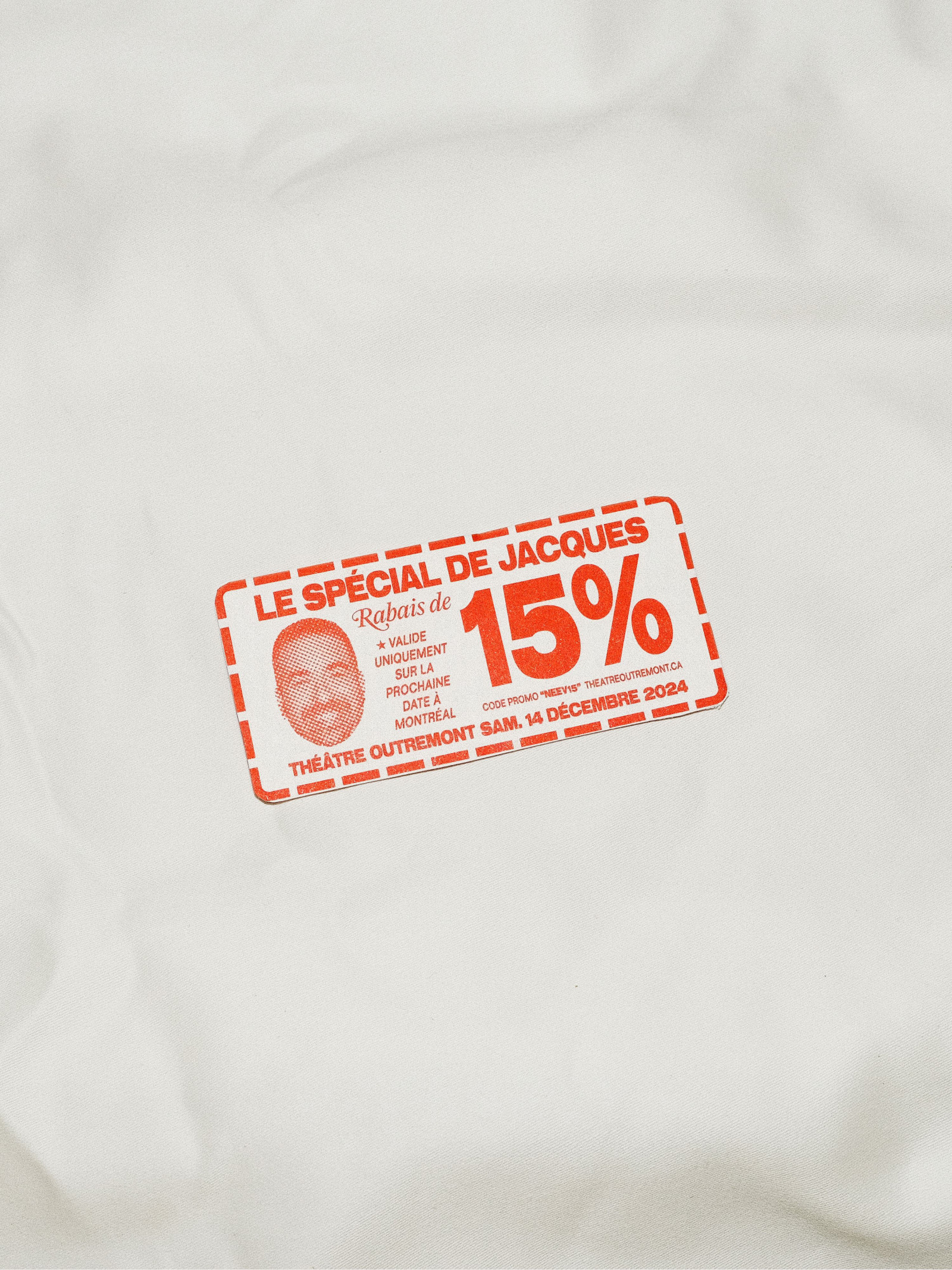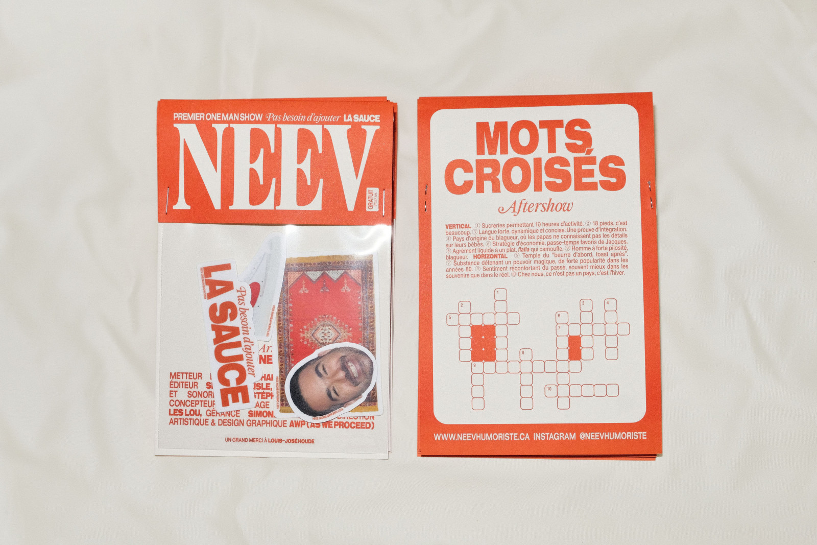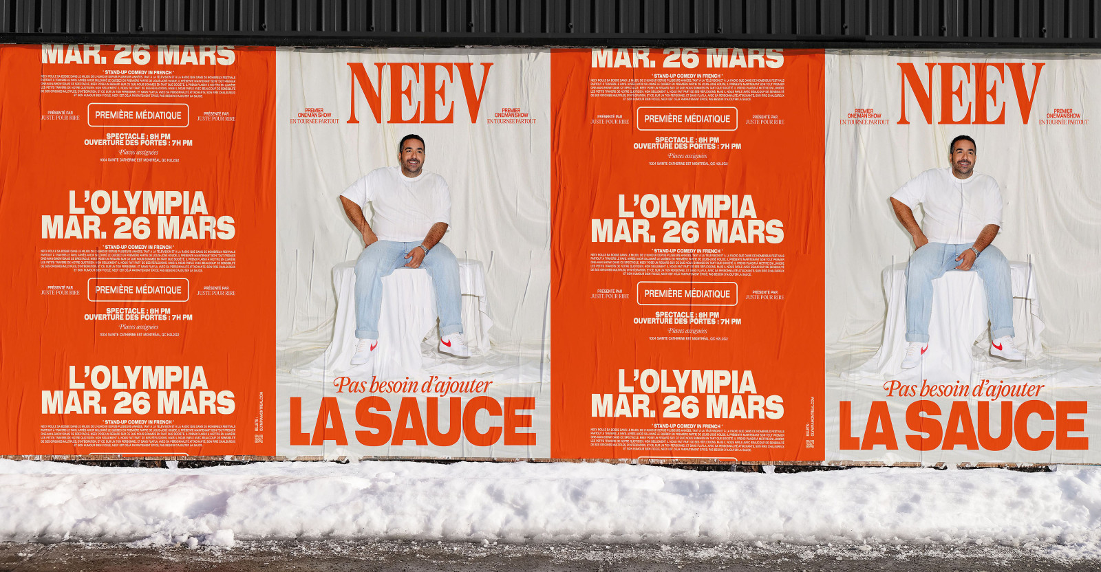 A shameless and saucy stand-up comedy show from Neev, a Jewish Moroccan Quebecer with a loud personality and undeniable authenticity. The show’s title – “No need to add Sauce” – refers to a french expression meaning something is bold enough that it doesn’t need extra flavour. Neev doesn't get into character, he is a character. Based-off a show segment where Neev depicts his and his father’s affection for coupons, the visual language and typography treatment draws inspiration from “good deals” grocery ads of the 90’s. With to-the-point photography, typefaces carrying the boldness and comfort of bodega’s spiced foods, the poster sets the table for the show, with a white tablecloth and a bottle of no-hard-feelings.
